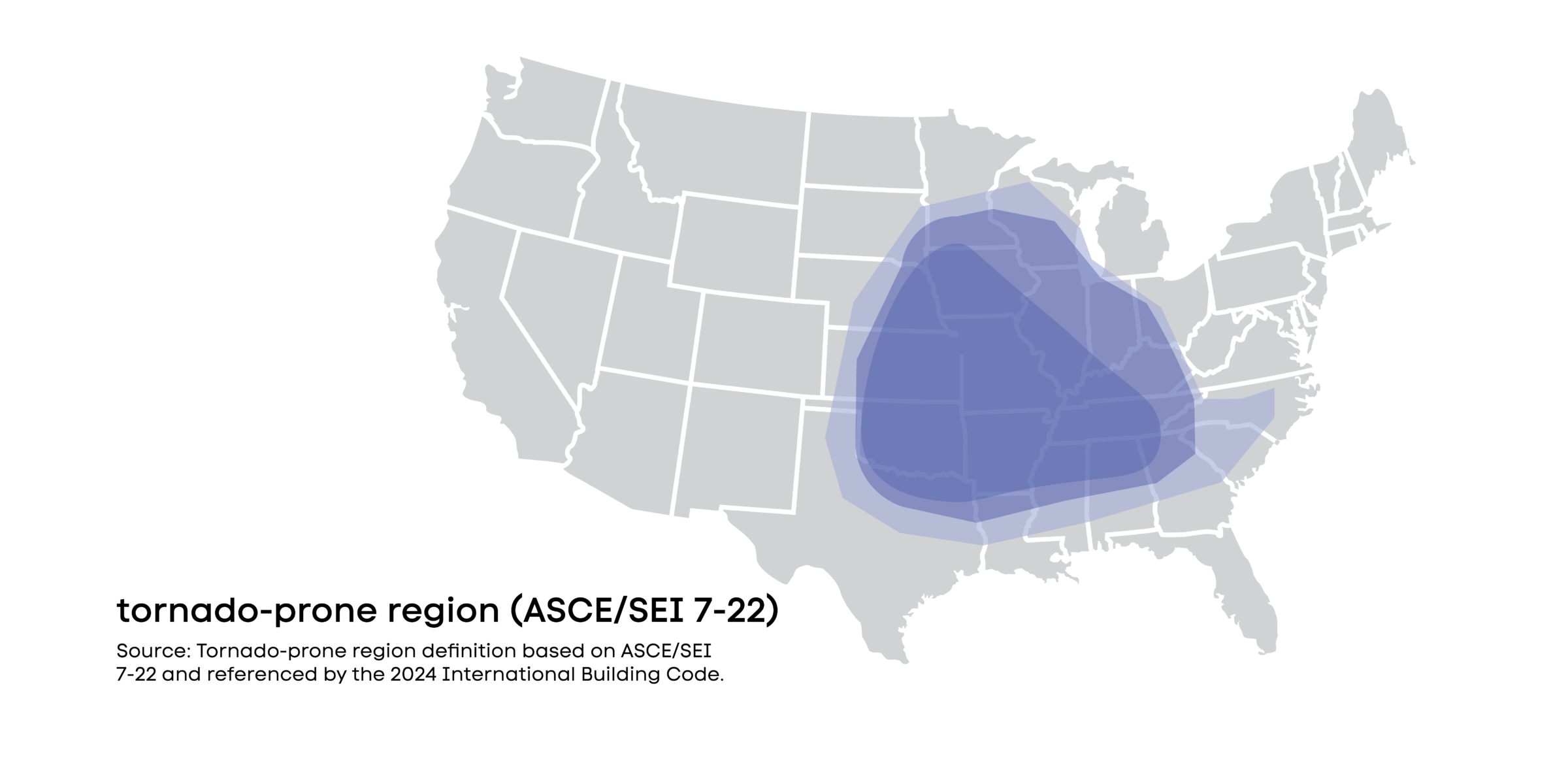 For the first time in the history of American building codes, tornado hazard design is now required for Risk Category III and IV buildings located in the designated tornado-prone region, defined in American Society of Civil Engineers ASCE/SEI 7-22 and referenced by the 2024 International Building Code (IBC) as the area of the United States roughly east of the Continental Divide.2