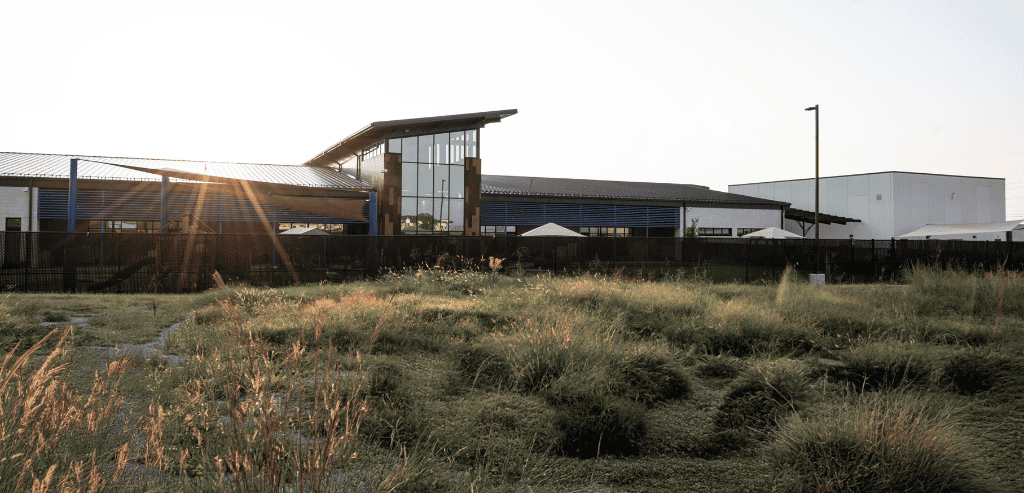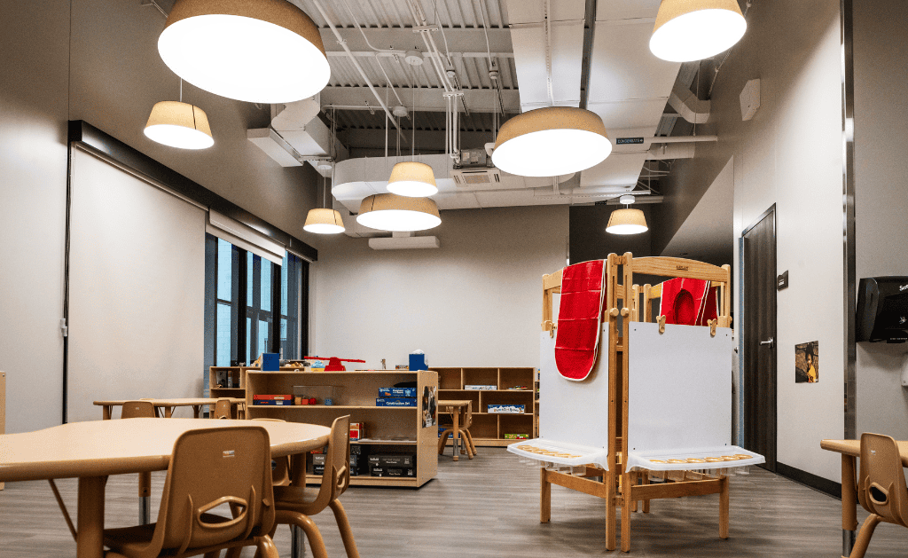 Located within MidAmerica Industrial Park, east of ‘The District,’ the 38,000 square foot facility supports early childhood education for up to 150 children across two programs, including Head Start and Early Head Start. The center features 15 classrooms designed for age-appropriate learning and flexibility, two kitchens to support daily nutrition needs, a FEMA-rated safe room, secure entrances, and nature-themed playgrounds. A small gross motor skills room encourages physical development and imaginative play, while thoughtfully designed spaces balance safety, functionality, and a nurturing environment.
