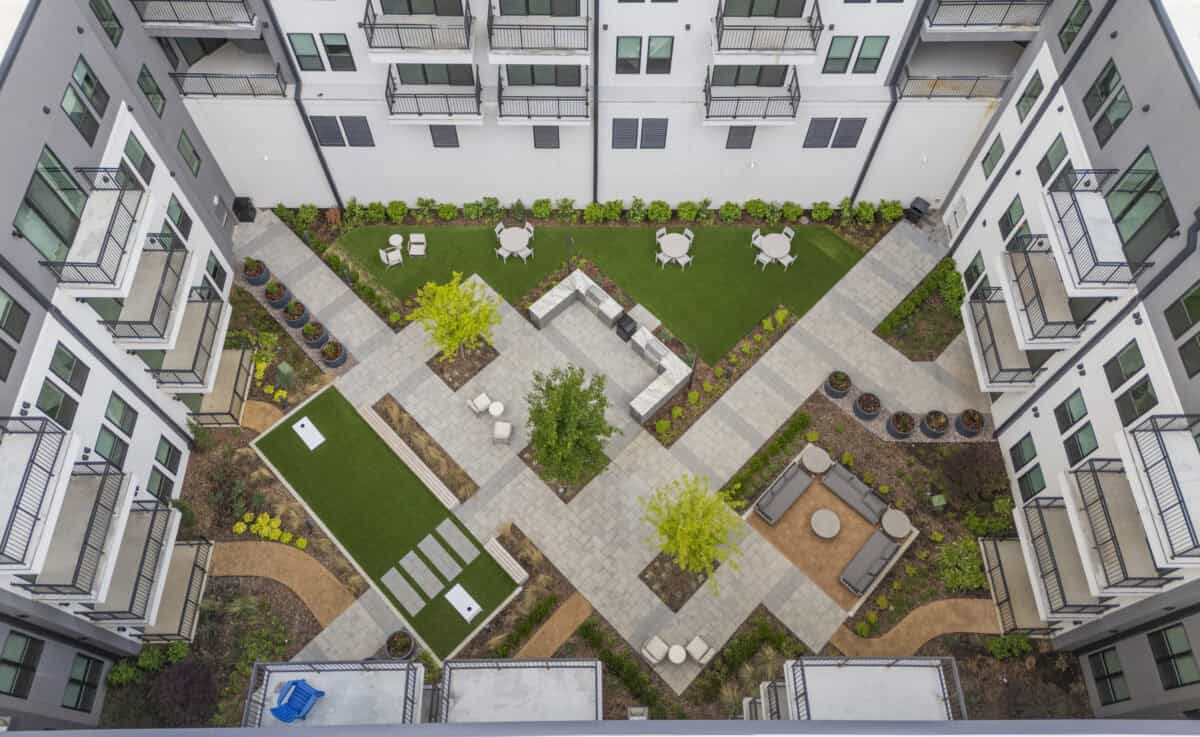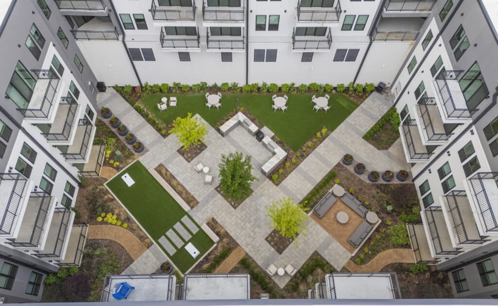 The landscape architecture design enhances outdoor spaces, public plazas and resident amenities while integrating with circulation and urban infrastructure. Thoughtful site planning and plantings encourage social interaction, relaxation and pedestrian connectivity, supporting Santa Fe Square’s vision as a vibrant center for downtown Tulsa.