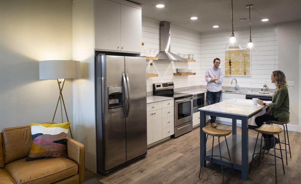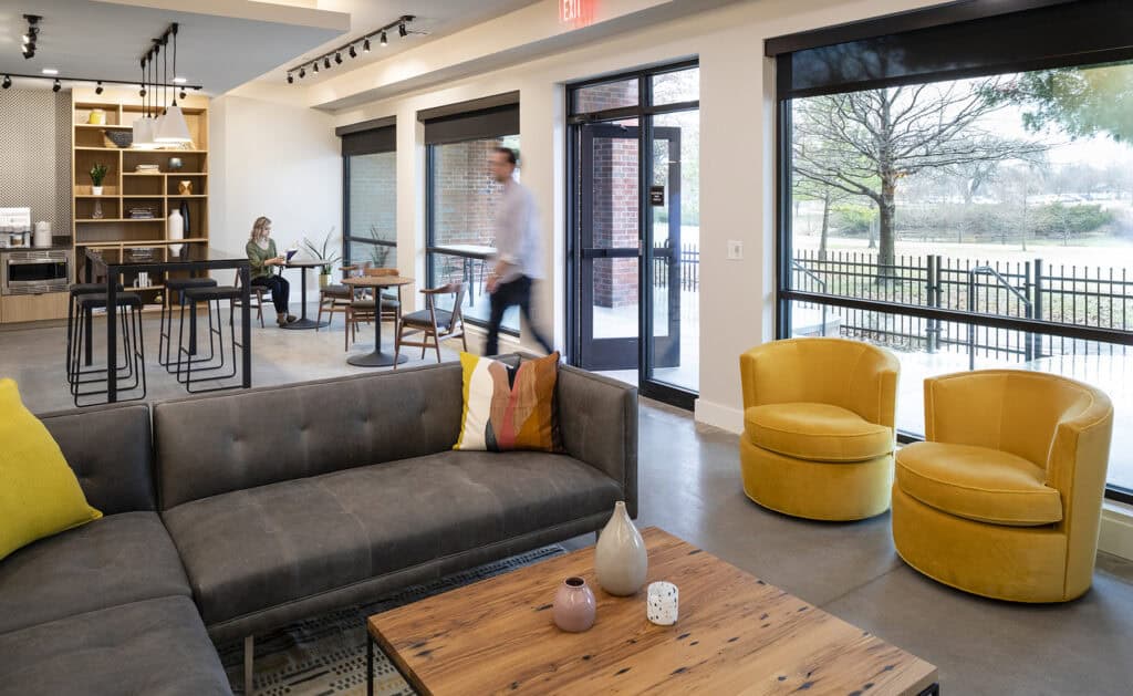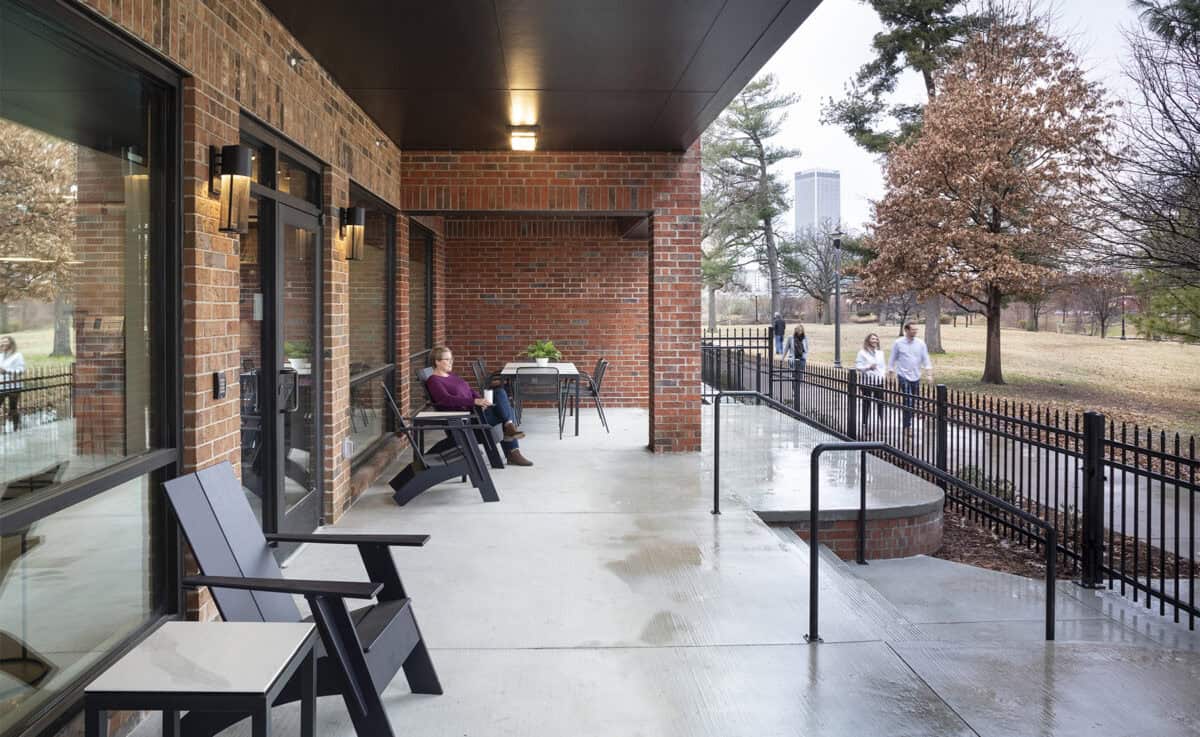 The 78-unit community includes a mix of studio, one-bedroom and two-bedroom apartments arranged across three-story residential buildings, anchored by a two-story common area that encourages interaction and shared use. Nestled directly south of Veterans Park, the site offers immediate access to outdoor recreation and is seamlessly connected to the Gathering Place and River Parks via the Midland Valley Trail system.